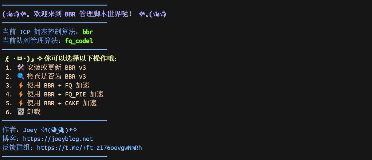 你可以随时检查当前的 TCP 拥塞算法和队列算法,甚至可以快速开启或关闭 BBR 加速。